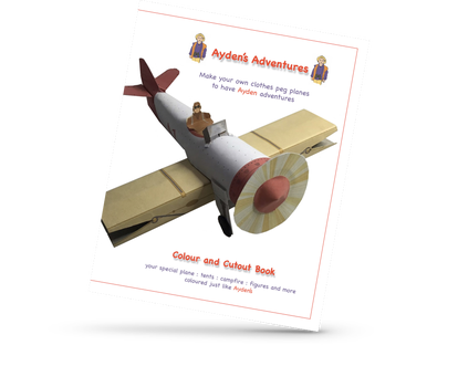 Get your new colour cutout book, to make your very own clothes peg planes, tent, campfire, figures and more! Coloured just like Ayden’s and have his adventures with grandpa. Have fun making your own plane colours, for your own adventures, wherever you