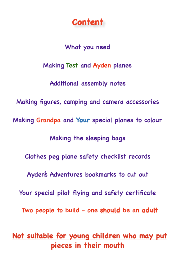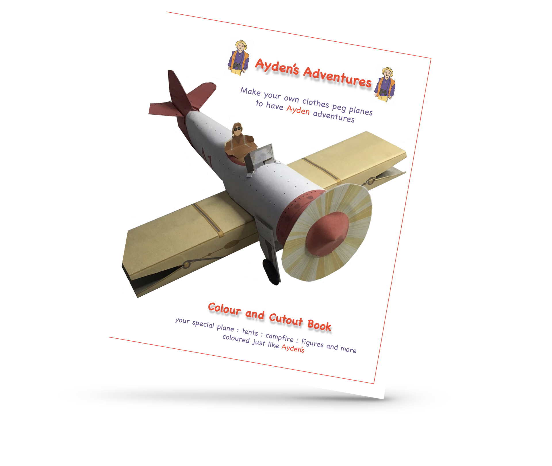 Get your new colour cutout book, to make your very own clothes peg planes, tent, campfire, figures and more! Coloured just like Ayden’s and have his adventures with grandpa. Have fun making your own plane colours, for your own adventures, wherever you